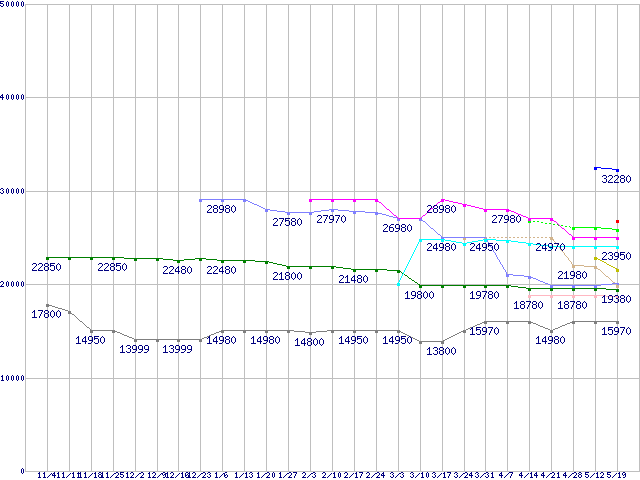 HDD 100〜160GB未満の最安値推移↑前グラフ↓次グラフ(2010年11月4日〜2011年5月19日)※このグラフは過去のデータも税率5%相当に調整した税込み相当額のグラフです。凡例VTX3MI-25SAT3-120G (120GB,MLC)AGT3-25SAT3-120G (120GB,MLC)VTX3-25SAT3-120G (120GB,MLC)CSSD-P3128GB2-BRKT (128GB,MLC)SSDSC2MH120A2K5 (120GB,MLC)CT128M4SSD2 (128GB,MLC)PX-128M2S (128GB,MLC)MTFDDAC128MAM-1J1 (128GB,MLC)CTFDDAC128MAG-1G1 (128GB,MLC)SSD 320 (120GB,MLC)その他2.5インチSSD 128GB (128GB,MLC)※製品名をクリックすると個別のグラフを表示します※点線部は販売店が確認できなかった、または調査データがないことを示します