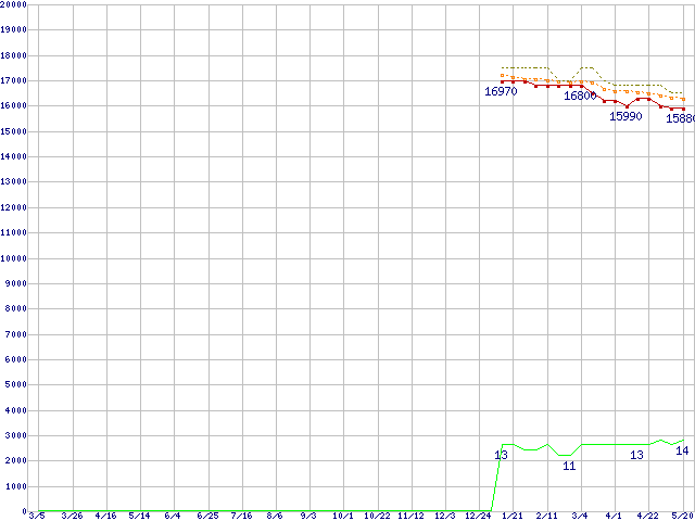 Core i5-2400 (3.10GHz,TDP 95W)の価格推移↑前グラフ↓次グラフ(2010年3月5日〜2011年5月20日)※このグラフは過去のデータも税率5%相当に調整した税込み相当額のグラフです。●関連グラフCPU主要製品の最安値推移CPU主要製品(最安値1万円〜2万円未満)の最安値推移Intel系CPUの最安値推移LGA1155 (Smart Cache 6MB,Quad Core,GPU内蔵)の最安値推移●凡例最安値(点線部は販売店未確認または未調査)平均値最高値ショップ数
