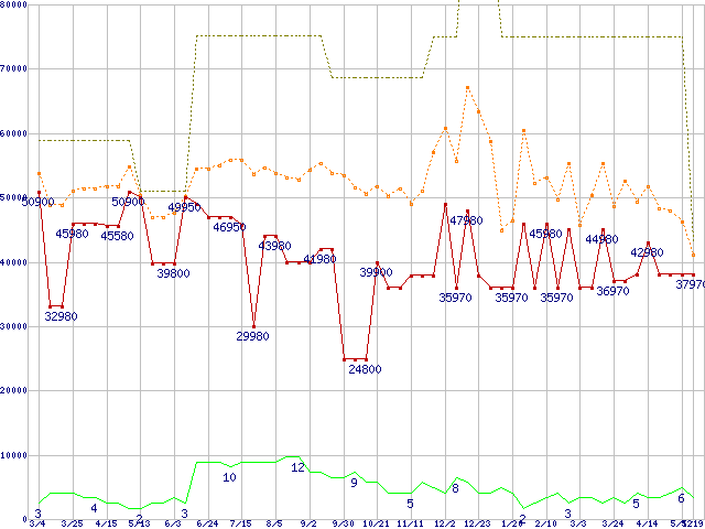 その他2.5インチSSD 256GB (256GB,MLC)の価格推移↑前グラフ↓次グラフ(2010年3月4日〜2011年5月19日)※このグラフは過去のデータも税率5%相当に調整した税込み相当額のグラフです。●関連グラフHDD/SSD主要製品の最安値推移HDD/SSD主要製品(最安値2万円以上)の最安値推移HDD 250〜300GB未満の最安値推移2.5インチSSD (SSD,3Gbps,2.5インチ)の最安値推移●凡例最安値(点線部は販売店未確認または未調査)平均値最高値ショップ数