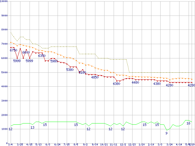 WD10EARS (1TB,64MB)の価格推移↑前グラフ↓次グラフ(2010年3月4日〜2011年5月19日)※このグラフは過去のデータも税率5%相当に調整した税込み相当額のグラフです。●関連グラフHDD/SSD主要製品の最安値推移HDD/SSD主要製品(最安値1万円未満)の最安値推移HDD 1TB〜1.5TB未満の最安値推移WD Caviar Green (3Gb/s)の最安値推移●凡例最安値(点線部は販売店未確認または未調査)平均値最高値ショップ数