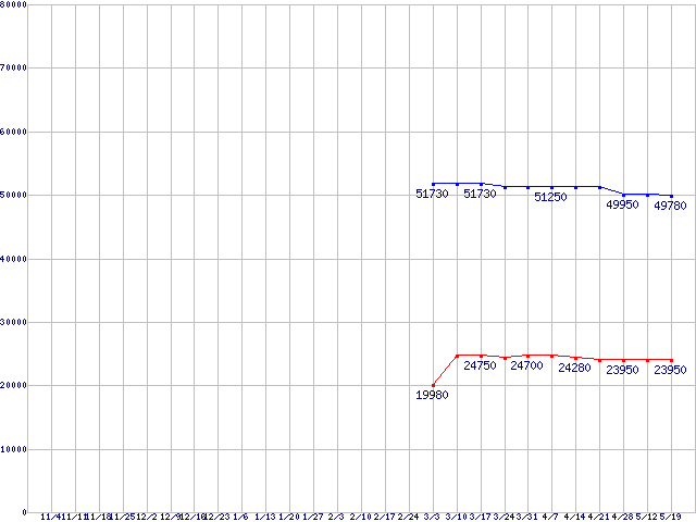 | SSD 510 (SSD,6Gbps,2.5インチ,リード500〜450MB/s・ライト315〜210MB/s)の最安値推移 |