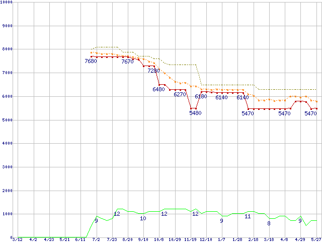 Athlon II X2 245e (2.9GHz,L2 1MB×2,TDP 45W)の価格推移↑前グラフ↓次グラフ(2010年3月12日〜2011年5月27日)※このグラフは過去のデータも税率5%相当に調整した税込み相当額のグラフです。●関連グラフCPU主要製品の最安値推移CPU主要製品(最安値1万円未満)の最安値推移AMD系CPUの最安値推移Socket AM3 (Dual Core)の最安値推移●凡例最安値(点線部は販売店未確認または未調査)平均値最高値ショップ数