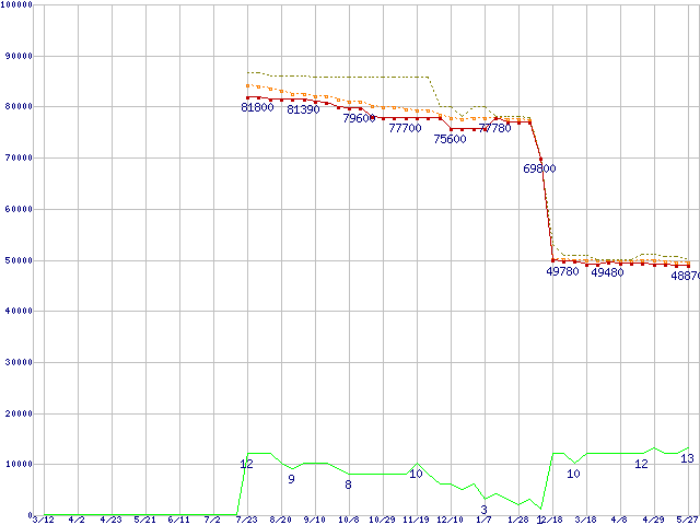 Core i7-970 (3.2GHz)の価格推移↑前グラフ↓次グラフ(2010年3月12日〜2011年5月27日)※このグラフは過去のデータも税率5%相当に調整した税込み相当額のグラフです。●関連グラフCPU主要製品の最安値推移CPU主要製品(最安値3万円〜6万円未満)の最安値推移Intel系CPUの最安値推移LGA1366 (QPI 4.8GT/s,L3キャッシュ12MB,6Core,Hyper-Threading,TDP 130W)の最安値推移●凡例最安値(点線部は販売店未確認または未調査)平均値最高値ショップ数