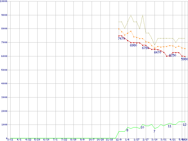 0S03085 (750GB,8MB)の価格推移↑前グラフ↓次グラフ(2010年3月11日〜2011年5月26日)※このグラフは過去のデータも税率5%相当に調整した税込み相当額のグラフです。●関連グラフHDD/SSD主要製品の最安値推移HDD/SSD主要製品(最安値1万円未満)の最安値推移HDD 750GB〜1TB未満の最安値推移TRAVELSTAR (5400rpm,3Gb/s,2.5インチ)の最安値推移●凡例最安値(点線部は販売店未確認または未調査)平均値最高値ショップ数