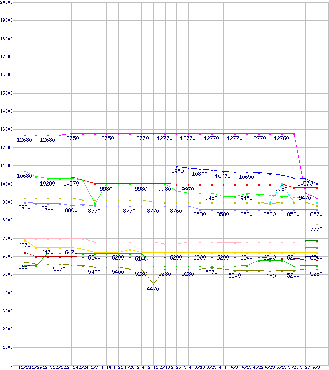 CPU主要製品(最安値1万円未満)の最安値推移↑前グラフ↓次グラフ(2010年11月19日〜2011年6月3日)※このグラフは過去のデータも税率5%相当に調整した税込み相当額のグラフです。凡例Core i3-2100 (3.1GHz,TDP 65W)Phenom II X2 565 Black Edition (3.4GHz,L2 512KB×2,L3 6MB)Athlon II X4 645 (3.1GHz,L2 512KB×4,TDP 95W)Athlon II X4 615e (2.5GHz,L2 512KB×4,TDP 45W)Phenom II X4 905e (2.5GHz,L2 512KB×4,L3 6MB,TDP 65W)Phenom II X2 560 Black Edition (3.3GHz,L2 512KB×2,L3 6MB)Athlon II X4 640 (3.0GHz,L2 512KB×4,TDP 95W)Pentium G850 (2.9GHz,TDP 65W)Pentium G840 (2.8GHz,TDP 65W)Athlon II X2 250e (3.0GHz,L2 1MB×2,TDP 45W)Pentium G620T (2.2GHz,TDP 35W)Athlon II X2 265 (3.3GHz,L2 1MB×2,TDP 65W)Pentium G620 (2.6GHz,TDP 65W)Athlon II X2 260 (3.2GHz,L2 1MB×2,TDP 65W)Athlon II X2 245e (2.9GHz,L2 1MB×2,TDP 45W)Athlon II X2 255 (3.1GHz,L2 1MB×2,TDP 65W)※製品名をクリックすると個別のグラフを表示します※点線部は販売店が確認できなかった、または調査データがないことを示します