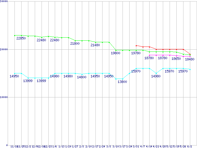 | HDD/SSD主要製品(最安値1万5千円〜2万円未満)の最安値推移 |