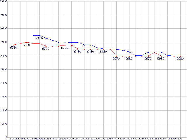 | HDD 750GB〜1TB未満の最安値推移 |