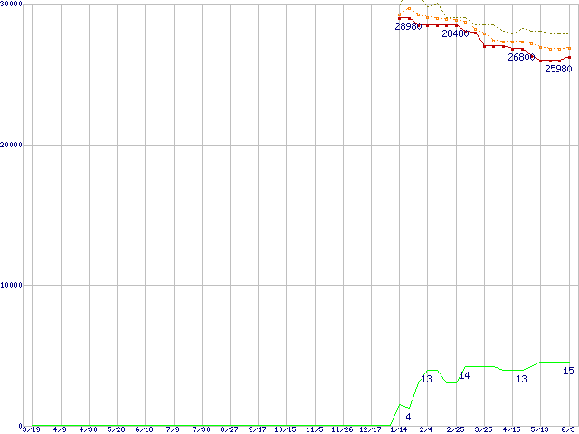 Core i7-2600K (3.40GHz)の価格推移↑前グラフ↓次グラフ(2010年3月19日〜2011年6月3日)※このグラフは過去のデータも税率5%相当に調整した税込み相当額のグラフです。●関連グラフCPU主要製品の最安値推移CPU主要製品(最安値2万円〜3万円未満)の最安値推移Intel系CPUの最安値推移LGA1155 (Smart Cache 8MB,Quad Core,GPU内蔵,Hyper-Threading,TDP 95W)の最安値推移●凡例最安値(点線部は販売店未確認または未調査)平均値最高値ショップ数