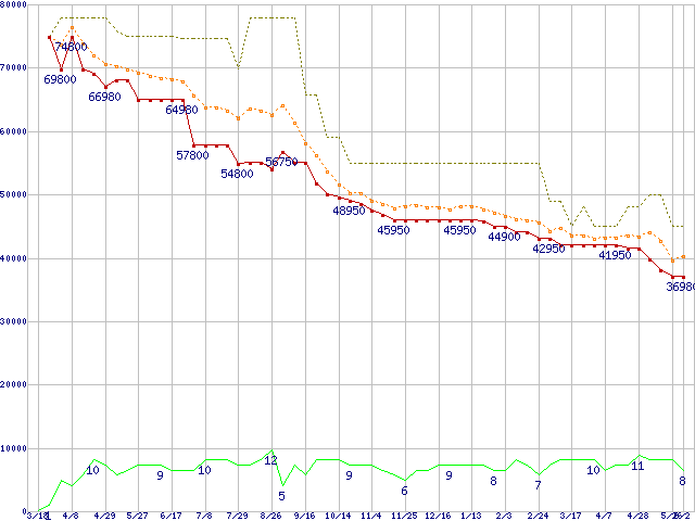 CTFDDAC256MAG-1G1 (256GB,MLC)の価格推移↑前グラフ↓次グラフ(2010年3月18日〜2011年6月2日)※このグラフは過去のデータも税率5%相当に調整した税込み相当額のグラフです。●関連グラフHDD/SSD主要製品の最安値推移HDD/SSD主要製品(最安値2万円以上)の最安値推移HDD 250〜300GB未満の最安値推移RealSSD C300 (SSD,6Gbps,2.5インチ,リード355MB/s・ライト215〜70MB/s)の最安値推移●凡例最安値(点線部は販売店未確認または未調査)平均値最高値ショップ数