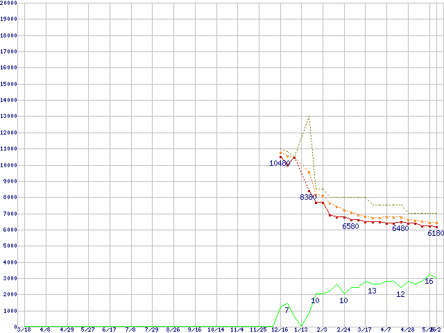 ST2000DL003 (2TB,64MB)の価格推移↑前グラフ(2010年3月18日〜2011年6月2日)※このグラフは過去のデータも税率5%相当に調整した税込み相当額のグラフです。●関連グラフHDD/SSD主要製品の最安値推移HDD/SSD主要製品(最安値1万円未満)の最安値推移HDD 2TB〜2.5TB未満の最安値推移Barracuda Green (5900rpm,6Gbps)の最安値推移●凡例最安値(点線部は販売店未確認または未調査)平均値最高値ショップ数