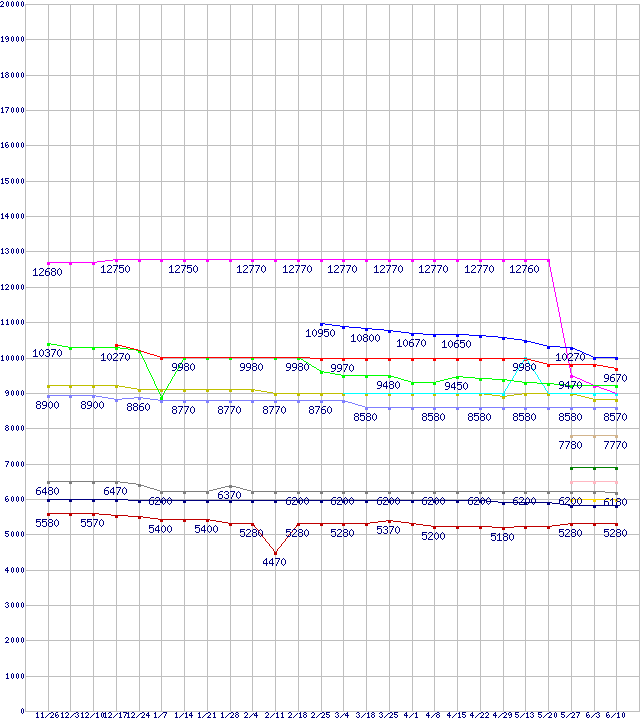 CPU主要製品(最安値1万円未満)の最安値推移↑前グラフ↓次グラフ(2010年11月26日〜2011年6月10日)※このグラフは過去のデータも税率5%相当に調整した税込み相当額のグラフです。凡例Core i3-2100 (3.1GHz,TDP 65W)Phenom II X2 565 Black Edition (3.4GHz,L2 512KB×2,L3 6MB)Athlon II X4 645 (3.1GHz,L2 512KB×4,TDP 95W)Athlon II X4 615e (2.5GHz,L2 512KB×4,TDP 45W)Phenom II X4 905e (2.5GHz,L2 512KB×4,L3 6MB,TDP 65W)Phenom II X2 560 Black Edition (3.3GHz,L2 512KB×2,L3 6MB)Athlon II X4 640 (3.0GHz,L2 512KB×4,TDP 95W)Pentium G850 (2.9GHz,TDP 65W)Pentium G840 (2.8GHz,TDP 65W)Pentium G620T (2.2GHz,TDP 35W)Athlon II X2 265 (3.3GHz,L2 1MB×2,TDP 65W)Pentium G620 (2.6GHz,TDP 65W)Athlon II X2 260 (3.2GHz,L2 1MB×2,TDP 65W)Athlon II X2 255 (3.1GHz,L2 1MB×2,TDP 65W)※製品名をクリックすると個別のグラフを表示します※点線部は販売店が確認できなかった、または調査データがないことを示します