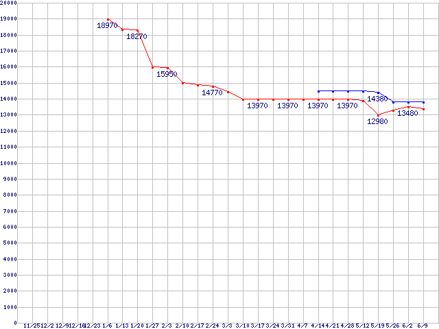 | HDD/SSD主要製品(最安値1万円〜1万5千円未満)の最安値推移 |
