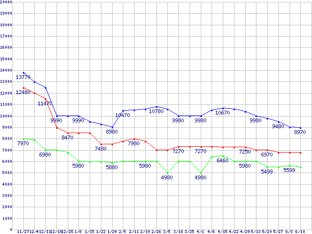 | メモリ主要製品(最安値5千円〜1万円未満)の最安値推移 |