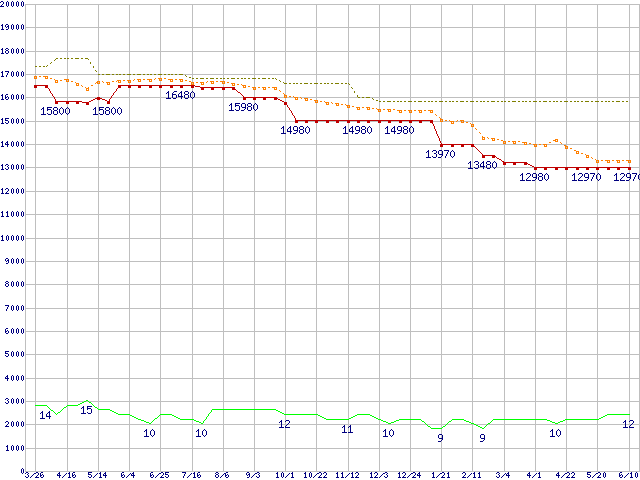 Phenom II X4 910e (2.6GHz,L2 512KB×4,L3 6MB,TDP 65W)の価格推移↑前グラフ↓次グラフ(2010年3月26日〜2011年6月10日)※このグラフは過去のデータも税率5%相当に調整した税込み相当額のグラフです。●関連グラフCPU主要製品の最安値推移CPU主要製品(最安値1万円〜2万円未満)の最安値推移AMD系CPUの最安値推移Socket AM3 (HyperTransport 3.0,Quad Core)の最安値推移●凡例最安値(点線部は販売店未確認または未調査)平均値最高値ショップ数