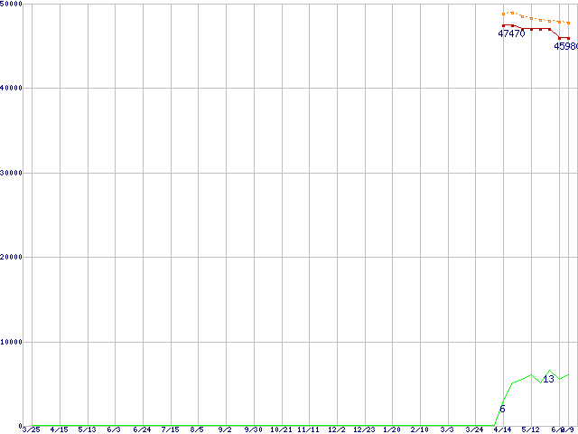 SSD 320 (300GB,MLC)の価格推移↑前グラフ↓次グラフ(2010年3月25日〜2011年6月9日)※このグラフは過去のデータも税率5%相当に調整した税込み相当額のグラフです。●関連グラフHDD/SSD主要製品の最安値推移HDD/SSD主要製品(最安値2万円以上)の最安値推移HDD 300〜400GB未満の最安値推移SSD 320 (SSD,3Gbps,2.5インチ,リード270〜200MB/s・ライト220〜45MB/s)の最安値推移●凡例最安値(点線部は販売店未確認または未調査)平均値最高値ショップ数