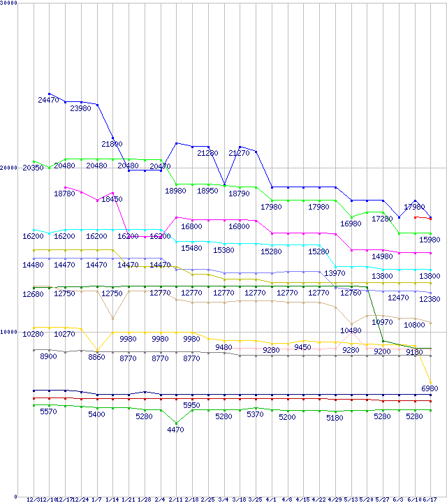 AMD系CPUの最安値推移↑前グラフ↓次グラフ(2010年12月3日〜2011年6月17日)※このグラフは過去のデータも税率5%相当に調整した税込み相当額のグラフです。凡例Phenom II X6 1100T Black Edition (3.3GHz,L2 512KB×6,L3 6MB,TDP 125W)Phenom II X4 980 Black Edition (3.7GHz,L2 512KB×4,L3 6MB,TDP 125W)Phenom II X6 1090T Black Edition (3.2GHz,L2 512KB×6,L3 6MB,TDP 125W)Phenom II X6 1065T (2.9GHz,L2 512KB×6,L3 6MB,TDP 95W)Phenom II X4 970 Black Edition (3.5GHz,L2 512KB×4,L3 6MB,TDP 125W)Phenom II X4 910e (2.6GHz,L2 512KB×4,L3 6MB,TDP 65W)Phenom II X4 965 Black Edition (3.4GHz,L2 512KB×4,L3 6MB,TDP 125W)Phenom II X4 955 (3.2GHz,L2 512KB×4,L3 6MB,TDP 95W)Athlon II X4 615e (2.5GHz,L2 512KB×4,TDP 45W)Phenom II X4 905e (2.5GHz,L2 512KB×4,L3 6MB,TDP 65W)Athlon II X4 640 (3.0GHz,L2 512KB×4,TDP 95W)Athlon II X4 645 (3.1GHz,L2 512KB×4,TDP 95W)Athlon II X2 265 (3.3GHz,L2 1MB×2,TDP 65W)Athlon II X2 260 (3.2GHz,L2 1MB×2,TDP 65W)Athlon II X2 255 (3.1GHz,L2 1MB×2,TDP 65W)※製品名をクリックすると個別のグラフを表示します※点線部は販売店が確認できなかった、または調査データがないことを示します