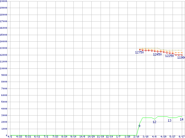 Core i3-2120 (3.3GHz,TDP 65W)の価格推移↑前グラフ↓次グラフ(2010年4月2日〜2011年6月17日)※このグラフは過去のデータも税率5%相当に調整した税込み相当額のグラフです。●関連グラフCPU主要製品の最安値推移CPU主要製品(最安値1万円〜2万円未満)の最安値推移Intel系CPUの最安値推移LGA1155 (Smart Cache 3MB,Dual Core,GPU内蔵,Hyper-Threading)の最安値推移●凡例最安値(点線部は販売店未確認または未調査)平均値最高値ショップ数