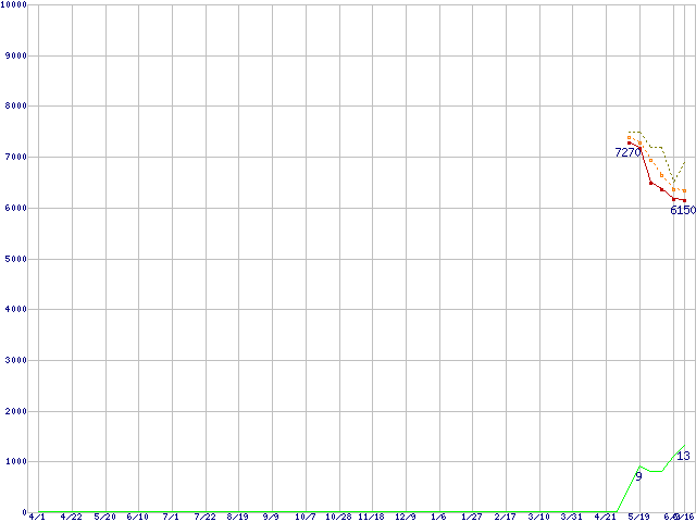 WD20EARX (2TB,64MB)の価格推移↑前グラフ↓次グラフ(2010年4月1日〜2011年6月16日)※このグラフは過去のデータも税率5%相当に調整した税込み相当額のグラフです。●関連グラフHDD/SSD主要製品の最安値推移HDD/SSD主要製品(最安値1万円未満)の最安値推移HDD 2TB〜2.5TB未満の最安値推移WD Caviar Green (6Gb/s)の最安値推移●凡例最安値(点線部は販売店未確認または未調査)平均値最高値ショップ数