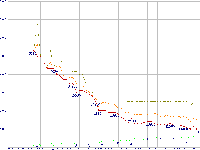 PC3-12800 4GB×3枚組みセットの価格推移↑前グラフ↓次グラフ(2010年4月3日〜2011年6月17日)※このグラフは過去のデータも税率5%相当に調整した税込み相当額のグラフです。●関連グラフメモリ主要製品の最安値推移メモリ主要製品(最安値5千円〜1万円未満)の最安値推移PC3-12800(DDR3-1600) DDR3 SDRAM DIMMの最安値推移●凡例最安値(点線部は販売店未確認または未調査)平均値最高値ショップ数