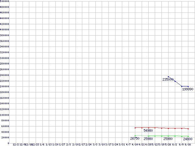 | Vertex 3 (SSD,6Gbps,2.5インチ,リード550〜530MB/s・ライト520〜450MB/s)の最安値推移 |