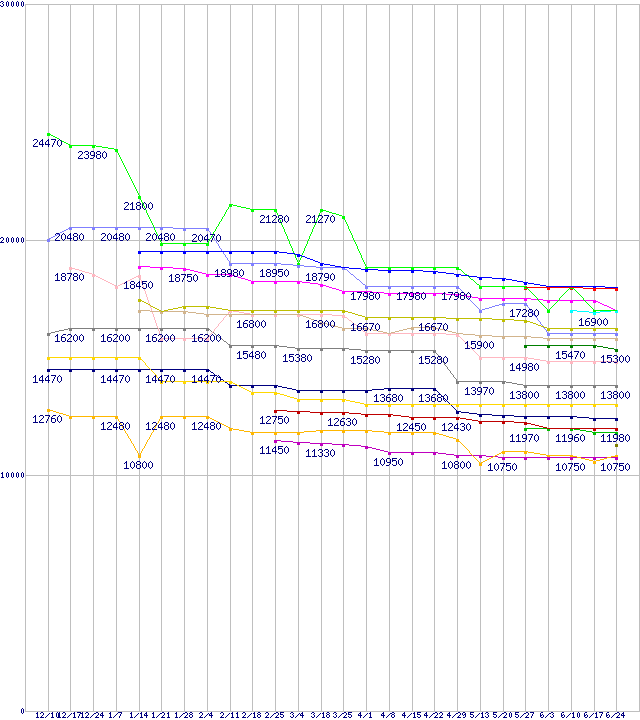 CPU主要製品(最安値1万円〜2万円未満)の最安値推移↑前グラフ↓次グラフ(2010年12月10日〜2011年6月24日)※このグラフは過去のデータも税率5%相当に調整した税込み相当額のグラフです。凡例Core i5-2500K (3.30GHz,TDP 95W)Core i5-2405S (2.50GHz,TDP 65W)Phenom II X6 1100T Black Edition (3.3GHz,L2 512KB×6,L3 6MB,TDP 125W)Core i5-2500 (3.30GHz,TDP 95W)Phenom II X4 980 Black Edition (3.7GHz,L2 512KB×4,L3 6MB,TDP 125W)Core i5-2400S (2.50GHz,TDP 65W)Phenom II X6 1090T Black Edition (3.2GHz,L2 512KB×6,L3 6MB,TDP 125W)Core i5-2400 (3.10GHz,TDP 95W)Core i5-2310 (2.90GHz,TDP 95W)Phenom II X6 1065T (2.9GHz,L2 512KB×6,L3 6MB,TDP 95W)Phenom II X4 970 Black Edition (3.5GHz,L2 512KB×4,L3 6MB,TDP 125W)Phenom II X4 910e (2.6GHz,L2 512KB×4,L3 6MB,TDP 65W)Phenom II X4 965 Black Edition (3.4GHz,L2 512KB×4,L3 6MB,TDP 125W)Core i3-2120 (3.3GHz,TDP 65W)Core i3-2105 (3.10GHz,TDP 65W)Phenom II X4 960T Black Edition (3.0GHz,L2 512KB×4,L3 6MB,TDP 95W)Phenom II X4 955 (3.2GHz,L2 512KB×4,L3 6MB,TDP 95W)Core i3-2100T (2.50GHz,TDP 35W)※製品名をクリックすると個別のグラフを表示します※点線部は販売店が確認できなかった、または調査データがないことを示します