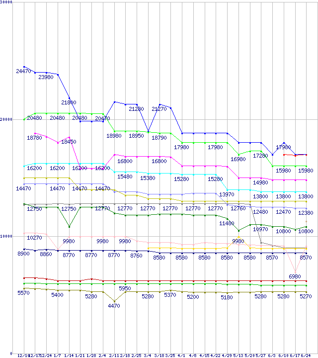 AMD系CPUの最安値推移↑前グラフ↓次グラフ(2010年12月10日〜2011年6月24日)※このグラフは過去のデータも税率5%相当に調整した税込み相当額のグラフです。凡例Phenom II X6 1100T Black Edition (3.3GHz,L2 512KB×6,L3 6MB,TDP 125W)Phenom II X4 980 Black Edition (3.7GHz,L2 512KB×4,L3 6MB,TDP 125W)Phenom II X6 1090T Black Edition (3.2GHz,L2 512KB×6,L3 6MB,TDP 125W)Phenom II X6 1065T (2.9GHz,L2 512KB×6,L3 6MB,TDP 95W)Phenom II X4 970 Black Edition (3.5GHz,L2 512KB×4,L3 6MB,TDP 125W)Phenom II X4 910e (2.6GHz,L2 512KB×4,L3 6MB,TDP 65W)Phenom II X4 965 Black Edition (3.4GHz,L2 512KB×4,L3 6MB,TDP 125W)Phenom II X4 960T Black Edition (3.0GHz,L2 512KB×4,L3 6MB,TDP 95W)Phenom II X4 955 (3.2GHz,L2 512KB×4,L3 6MB,TDP 95W)Athlon II X4 645 (3.1GHz,L2 512KB×4,TDP 95W)Athlon II X4 615e (2.5GHz,L2 512KB×4,TDP 45W)Phenom II X4 905e (2.5GHz,L2 512KB×4,L3 6MB,TDP 65W)Athlon II X4 640 (3.0GHz,L2 512KB×4,TDP 95W)Athlon II X2 265 (3.3GHz,L2 1MB×2,TDP 65W)Athlon II X2 260 (3.2GHz,L2 1MB×2,TDP 65W)Athlon II X2 255 (3.1GHz,L2 1MB×2,TDP 65W)※製品名をクリックすると個別のグラフを表示します※点線部は販売店が確認できなかった、または調査データがないことを示します