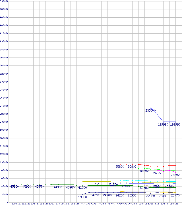 HDD/SSD主要製品(最安値2万円以上)の最安値推移↑前グラフ(2010年12月9日〜2011年6月23日)※このグラフは過去のデータも税率5%相当に調整した税込み相当額のグラフです。凡例VTX3-25SAT3-480G (480GB,MLC)SSD 320 (600GB,MLC)CT512M4SSD2 (512GB,MLC)その他6Gbps対応SSD (480〜512GB,MLC)VTX3-25SAT3-240G (240GB,MLC)SSDSC2MH250A2K5 (250GB,MLC)SSD 320 (300GB,MLC)CT256M4SSD2 (256GB,MLC)CTFDDAC256MAG-1G1 (256GB,MLC)その他6Gbps対応SSD (240〜256GB,MLC)SSD 320 (160GB,MLC)VTX3-25SAT3-120G (120GB,MLC)SSDSC2MH120A2K5 (120GB,MLC)※製品名をクリックすると個別のグラフを表示します※点線部は販売店が確認できなかった、または調査データがないことを示します