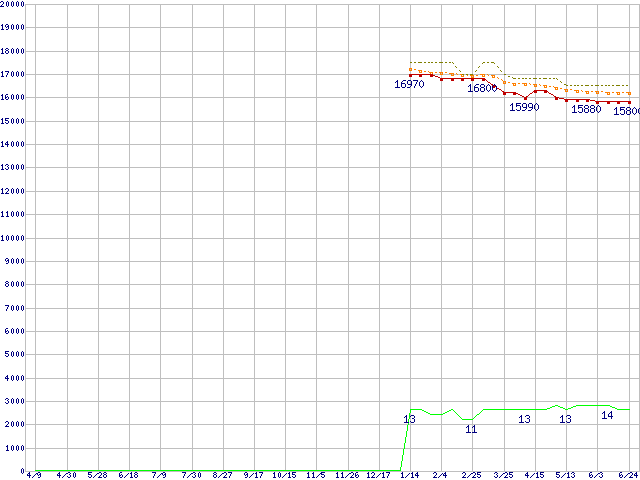 Core i5-2400 (3.10GHz,TDP 95W)の価格推移↑前グラフ↓次グラフ(2010年4月9日〜2011年6月24日)※このグラフは過去のデータも税率5%相当に調整した税込み相当額のグラフです。●関連グラフCPU主要製品の最安値推移CPU主要製品(最安値1万円〜2万円未満)の最安値推移Intel系CPUの最安値推移LGA1155 (Smart Cache 6MB,Quad Core,GPU内蔵)の最安値推移●凡例最安値(点線部は販売店未確認または未調査)平均値最高値ショップ数