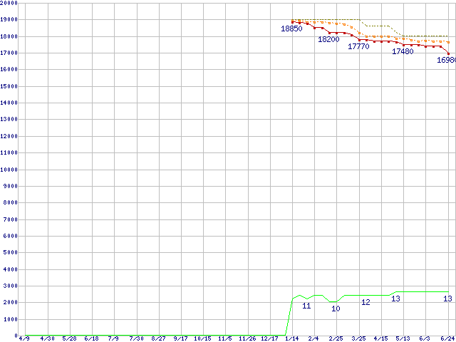 Core i5-2500 (3.30GHz,TDP 95W)の価格推移↑前グラフ↓次グラフ(2010年4月9日〜2011年6月24日)※このグラフは過去のデータも税率5%相当に調整した税込み相当額のグラフです。●関連グラフCPU主要製品の最安値推移CPU主要製品(最安値1万円〜2万円未満)の最安値推移Intel系CPUの最安値推移LGA1155 (Smart Cache 6MB,Quad Core,GPU内蔵)の最安値推移●凡例最安値(点線部は販売店未確認または未調査)平均値最高値ショップ数