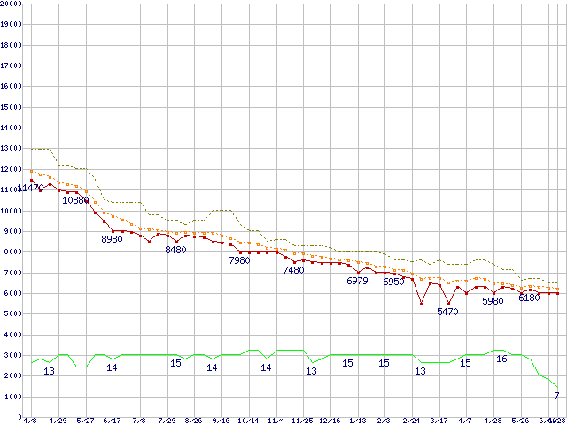 WD20EARS (2TB,64MB)の価格推移↑前グラフ↓次グラフ(2010年4月8日〜2011年6月23日)※このグラフは過去のデータも税率5%相当に調整した税込み相当額のグラフです。●関連グラフHDD/SSD主要製品の最安値推移HDD/SSD主要製品(最安値1万円未満)の最安値推移HDD 2TB〜2.5TB未満の最安値推移WD Caviar Green (3Gb/s)の最安値推移●凡例最安値(点線部は販売店未確認または未調査)平均値最高値ショップ数