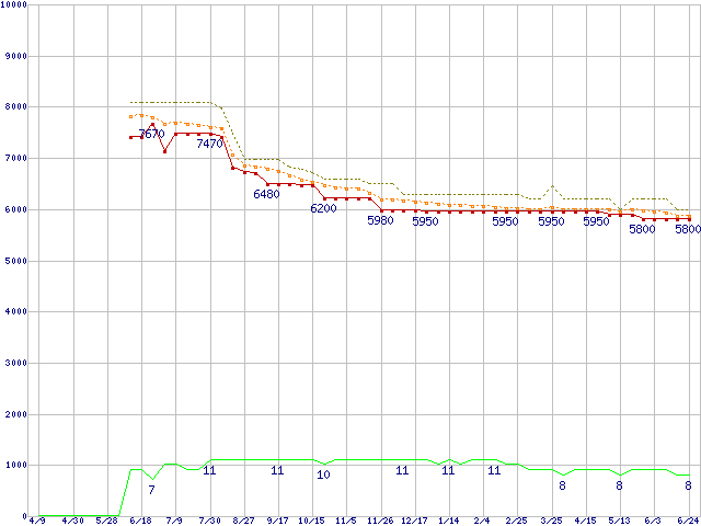 Athlon II X2 260 (3.2GHz,L2 1MB×2,TDP 65W)の価格推移↑前グラフ↓次グラフ(2010年4月9日〜2011年6月24日)※このグラフは過去のデータも税率5%相当に調整した税込み相当額のグラフです。●関連グラフCPU主要製品の最安値推移CPU主要製品(最安値1万円未満)の最安値推移AMD系CPUの最安値推移Socket AM3 (Dual Core)の最安値推移●凡例最安値(点線部は販売店未確認または未調査)平均値最高値ショップ数