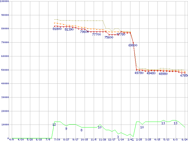 Core i7-970 (3.2GHz)の価格推移↑前グラフ↓次グラフ(2010年4月9日〜2011年6月24日)※このグラフは過去のデータも税率5%相当に調整した税込み相当額のグラフです。●関連グラフCPU主要製品の最安値推移CPU主要製品(最安値3万円〜6万円未満)の最安値推移Intel系CPUの最安値推移LGA1366 (QPI 4.8GT/s,L3キャッシュ12MB,6Core,Hyper-Threading,TDP 130W)の最安値推移●凡例最安値(点線部は販売店未確認または未調査)平均値最高値ショップ数