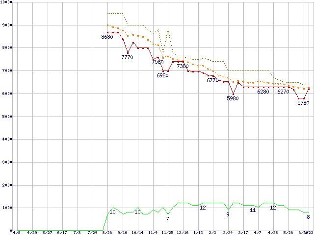 HD204UI (2TB,32MB)の価格推移↑前グラフ↓次グラフ(2010年4月8日〜2011年6月23日)※このグラフは過去のデータも税率5%相当に調整した税込み相当額のグラフです。●関連グラフHDD/SSD主要製品の最安値推移HDD/SSD主要製品(最安値1万円未満)の最安値推移HDD 2TB〜2.5TB未満の最安値推移EcoGreent F4 (5400rpm,3Gb/s,3.5インチ)の最安値推移●凡例最安値(点線部は販売店未確認または未調査)平均値最高値ショップ数