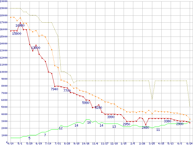 PC3-10600 4GBの価格推移↓次グラフ(2010年4月10日〜2011年6月24日)※このグラフは過去のデータも税率5%相当に調整した税込み相当額のグラフです。●関連グラフメモリ主要製品の最安値推移4GBモジュール/2GBモジュール×2枚の最安値推移メモリ主要製品(最安値5千円未満)の最安値推移PC3-10600(DDR3-1333) DDR3 SDRAM DIMMの最安値推移●凡例最安値(点線部は販売店未確認または未調査)平均値最高値ショップ数