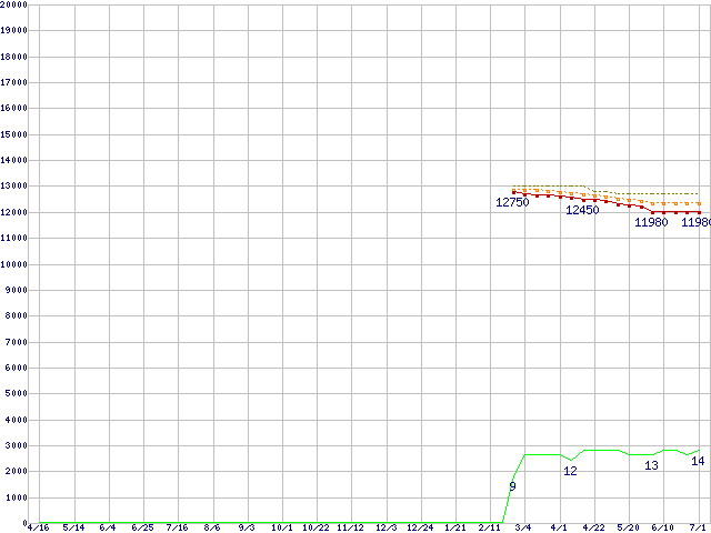Core i3-2120 (3.3GHz,TDP 65W)の価格推移↑前グラフ↓次グラフ(2010年4月16日〜2011年7月1日)※このグラフは過去のデータも税率5%相当に調整した税込み相当額のグラフです。●関連グラフCPU主要製品の最安値推移CPU主要製品(最安値1万円〜2万円未満)の最安値推移Intel系CPUの最安値推移LGA1155 (Smart Cache 3MB,Dual Core,GPU内蔵,Hyper-Threading)の最安値推移●凡例最安値(点線部は販売店未確認または未調査)平均値最高値ショップ数