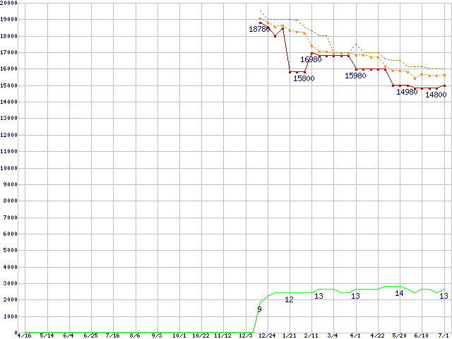 Phenom II X6 1065T (2.9GHz,L2 512KB×6,L3 6MB,TDP 95W)の価格推移↑前グラフ↓次グラフ(2010年4月16日〜2011年7月1日)※このグラフは過去のデータも税率5%相当に調整した税込み相当額のグラフです。●関連グラフCPU主要製品の最安値推移CPU主要製品(最安値1万円〜2万円未満)の最安値推移AMD系CPUの最安値推移Socket AM3 (HyperTransport 3.0,6Core)の最安値推移●凡例最安値(点線部は販売店未確認または未調査)平均値最高値ショップ数