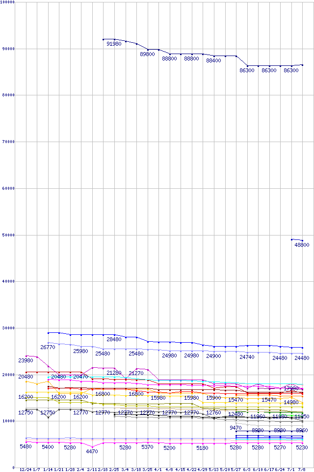 CPU主要製品の最安値推移↑前グラフ↓次グラフ(2010年12月24日〜2011年7月8日)※このグラフは過去のデータも税率5%相当に調整した税込み相当額のグラフです。凡例Core i7-990X Extreme Edition (3.46GHz)Core i7-980 (3.33GHz)Core i7-2600K (3.40GHz)Core i7-2600 (3.40GHz)Core i5-2500K (3.30GHz,TDP 95W)Core i5-2405S (2.50GHz,TDP 65W)Core i5-2500 (3.30GHz,TDP 95W)Phenom II X6 1100T Black Edition (3.3GHz,L2 512KB×6,L3 6MB,TDP 125W)Phenom II X4 980 Black Edition (3.7GHz,L2 512KB×4,L3 6MB,TDP 125W)Core i5-2400S (2.50GHz,TDP 65W)Phenom II X6 1090T Black Edition (3.2GHz,L2 512KB×6,L3 6MB,TDP 125W)Core i5-2400 (3.10GHz,TDP 95W)Core i5-2310 (2.90GHz,TDP 95W)Phenom II X6 1065T (2.9GHz,L2 512KB×6,L3 6MB,TDP 95W)Phenom II X4 970 Black Edition (3.5GHz,L2 512KB×4,L3 6MB,TDP 125W)A8-3850 (2.9GHz,TDP 100W)Phenom II X4 910e (2.6GHz,L2 512KB×4,L3 6MB,TDP 65W)Phenom II X4 965 Black Edition (3.4GHz,L2 512KB×4,L3 6MB,TDP 125W)Core i3-2120 (3.3GHz,TDP 65W)Core i3-2105 (3.10GHz,TDP 65W)A6-3650 (2.6GHz,TDP 100W)Phenom II X4 960T Black Edition (3.0GHz,L2 512KB×4,L3 6MB,TDP 95W)Core i3-2100T (2.50GHz,TDP 35W)Phenom II X4 955 (3.2GHz,L2 512KB×4,L3 6MB,TDP 95W)Core i3-2100 (3.1GHz,TDP 65W)Athlon II X4 615e (2.5GHz,L2 512KB×4,TDP 45W)Pentium G850 (2.9GHz,TDP 65W)Pentium G840 (2.8GHz,TDP 65W)Pentium G620T (2.2GHz,TDP 35W)Athlon II X2 265 (3.3GHz,L2 1MB×2,TDP 65W)Pentium G620 (2.6GHz,TDP 65W)Athlon II X2 260 (3.2GHz,L2 1MB×2,TDP 65W)Athlon II X2 255 (3.1GHz,L2 1MB×2,TDP 65W)※製品名をクリックすると個別のグラフを表示します※点線部は販売店が確認できなかった、または調査データがないことを示します
