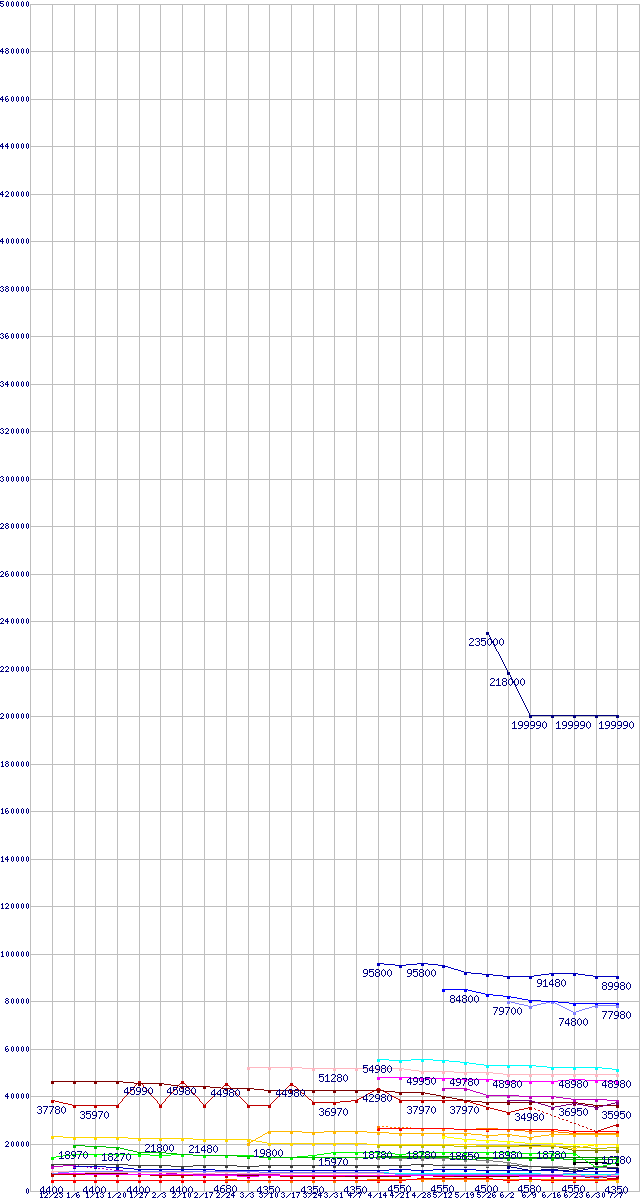 HDD/SSD主要製品の最安値推移↑前グラフ↓次グラフ(2010年12月23日〜2011年7月7日)※このグラフは過去のデータも税率5%相当に調整した税込み相当額のグラフです。凡例VTX3-25SAT3-480G (480GB,MLC)SSD 320 (600GB,MLC)CT512M4SSD2 (512GB,MLC)その他6Gbps対応SSD (480〜512GB,MLC)VTX3-25SAT3-240G (240GB,MLC)SSDSC2MH250A2K5 (250GB,MLC)SSD 320 (300GB,MLC)CT256M4SSD2 (256GB,MLC)その他6Gbps対応SSD (240〜256GB,MLC)CTFDDAC256MAG-1G1 (256GB,MLC)その他2.5インチSSD (256GB,MLC)SSD 320 (160GB,MLC)VTX3-25SAT3-120G (120GB,MLC)SSDSC2MH120A2K5 (120GB,MLC)CTFDDAC128MAG-1G1 (128GB,MLC)CT128M4SSD2 (128GB,MLC)SSD 320 (120GB,MLC)その他6Gbps対応SSD (120〜128GB,MLC)VTX3-25SAT3-60G (60GB,MLC)SSD 320 (80GB,MLC)0S03088(純正パッケージ品) (3TB,64MB)その他2.5インチSSD (128GB,MLC)0S03229(純正パッケージ品) (3TB,32MB)CTFDDAC064MAG-1G1 (64GB,MLC)WD30EZRX (3TB,64MB)CT064M4SSD2 (64GB,MLC)その他6Gbps対応SSD (60〜64GB,MLC)0S03191(純正パッケージ品) (2TB,64MB)HN-M101MBB (1TB,8MB)その他2.5インチSSD (64GB,MLC)0S03224(純正パッケージ品) (2TB,32MB)WD10TPVT (1TB,8MB,12.5mm厚)HD204UI (2TB,32MB)ST2000DL003 (2TB,64MB)WD20EARX (2TB,64MB)0S03085 (750GB,8MB)WD7500BPVT (750GB,8MB)0S02598 (500GB,8MB)ST31000524AS (1TB,32MB)WD10EARX (1TB,64MB)※製品名をクリックすると個別のグラフを表示します※点線部は販売店が確認できなかった、または調査データがないことを示します