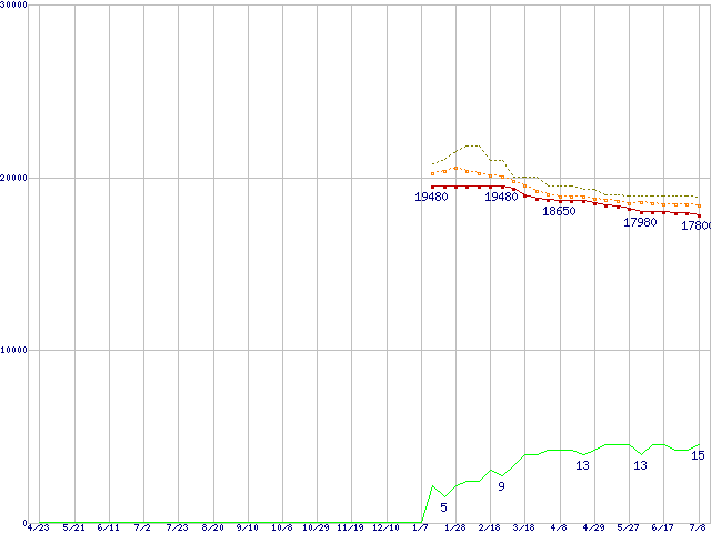 Core i5-2500K (3.30GHz,TDP 95W)の価格推移↑前グラフ↓次グラフ(2010年4月23日〜2011年7月8日)※このグラフは過去のデータも税率5%相当に調整した税込み相当額のグラフです。●関連グラフCPU主要製品の最安値推移CPU主要製品(最安値1万円〜2万円未満)の最安値推移Intel系CPUの最安値推移LGA1155 (Smart Cache 6MB,Quad Core,GPU内蔵)の最安値推移●凡例最安値(点線部は販売店未確認または未調査)平均値最高値ショップ数