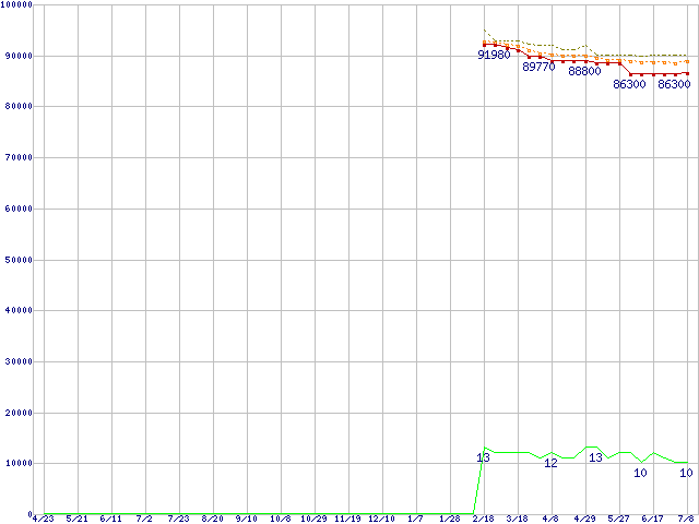 Core i7-990X Extreme Edition (3.46GHz)の価格推移↑前グラフ↓次グラフ(2010年4月23日〜2011年7月8日)※このグラフは過去のデータも税率5%相当に調整した税込み相当額のグラフです。●関連グラフCPU主要製品の最安値推移CPU主要製品(最安値6万円以上)の最安値推移Intel系CPUの最安値推移LGA1366 (QPI 6.4GT/s,L3キャッシュ12MB,6Core,Hyper-Threading,TDP 130W)の最安値推移●凡例最安値(点線部は販売店未確認または未調査)平均値最高値ショップ数