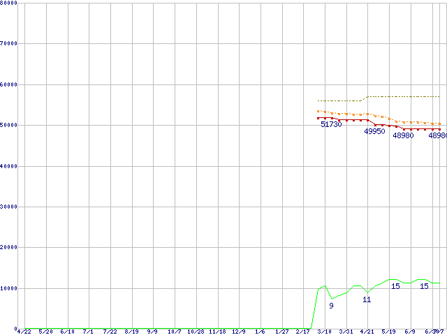 SSDSC2MH250A2K5 (250GB,MLC)の価格推移↑前グラフ↓次グラフ(2010年4月22日〜2011年7月7日)※このグラフは過去のデータも税率5%相当に調整した税込み相当額のグラフです。●関連グラフHDD/SSD主要製品の最安値推移HDD/SSD主要製品(最安値2万円以上)の最安値推移HDD 250〜300GB未満の最安値推移SSD 510 (SSD,6Gbps,2.5インチ,リード500〜450MB/s・ライト315〜210MB/s)の最安値推移●凡例最安値(点線部は販売店未確認または未調査)平均値最高値ショップ数