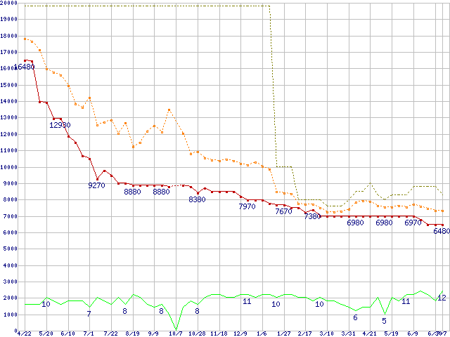 WD10TPVT (1TB,8MB,12.5mm厚)の価格推移↑前グラフ↓次グラフ(2010年4月22日〜2011年7月7日)※このグラフは過去のデータも税率5%相当に調整した税込み相当額のグラフです。●関連グラフHDD/SSD主要製品の最安値推移HDD/SSD主要製品(最安値1万円未満)の最安値推移HDD 1TB〜1.5TB未満の最安値推移WD Scorpio Blue (5200〜5400rpm,3Gb/s,2.5インチ)の最安値推移●凡例最安値(点線部は販売店未確認または未調査)平均値最高値ショップ数