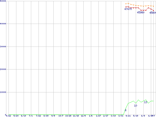 SSD 320 (300GB,MLC)の価格推移↑前グラフ↓次グラフ(2010年4月22日〜2011年7月7日)※このグラフは過去のデータも税率5%相当に調整した税込み相当額のグラフです。●関連グラフHDD/SSD主要製品の最安値推移HDD/SSD主要製品(最安値2万円以上)の最安値推移HDD 300〜400GB未満の最安値推移SSD 320 (SSD,3Gbps,2.5インチ,リード270〜200MB/s・ライト220〜45MB/s)の最安値推移●凡例最安値(点線部は販売店未確認または未調査)平均値最高値ショップ数