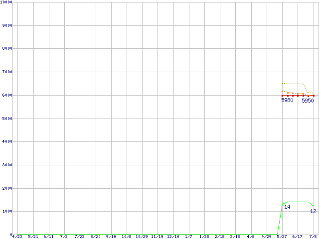 Pentium G620 (2.6GHz,TDP 65W)の価格推移↑前グラフ↓次グラフ(2010年4月23日〜2011年7月8日)※このグラフは過去のデータも税率5%相当に調整した税込み相当額のグラフです。●関連グラフCPU主要製品の最安値推移CPU主要製品(最安値1万円未満)の最安値推移Intel系CPUの最安値推移LGA1155 (Smart Cache 3MB,Dual Core,GPU内蔵)の最安値推移●凡例最安値(点線部は販売店未確認または未調査)平均値最高値ショップ数