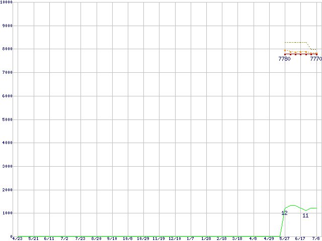 Pentium G850 (2.9GHz,TDP 65W)の価格推移↑前グラフ↓次グラフ(2010年4月23日〜2011年7月8日)※このグラフは過去のデータも税率5%相当に調整した税込み相当額のグラフです。●関連グラフCPU主要製品の最安値推移CPU主要製品(最安値1万円未満)の最安値推移Intel系CPUの最安値推移LGA1155 (Smart Cache 3MB,Dual Core,GPU内蔵)の最安値推移●凡例最安値(点線部は販売店未確認または未調査)平均値最高値ショップ数
