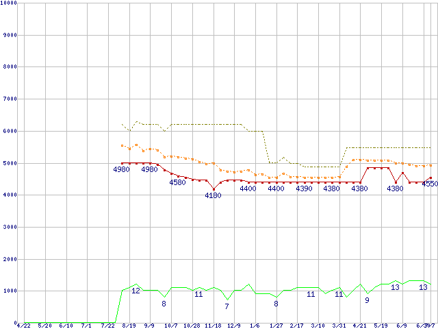 0S02598 (500GB,8MB)の価格推移↑前グラフ↓次グラフ(2010年4月22日〜2011年7月7日)※このグラフは過去のデータも税率5%相当に調整した税込み相当額のグラフです。●関連グラフHDD/SSD主要製品の最安値推移HDD/SSD主要製品(最安値1万円未満)の最安値推移HDD 500〜600GB未満の最安値推移TRAVELSTAR (5400rpm,3Gb/s,2.5インチ)の最安値推移●凡例最安値(点線部は販売店未確認または未調査)平均値最高値ショップ数