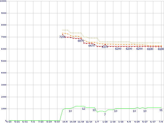 Athlon II X2 265 (3.3GHz,L2 1MB×2,TDP 65W)の価格推移↓次グラフ(2010年4月23日〜2011年7月8日)※このグラフは過去のデータも税率5%相当に調整した税込み相当額のグラフです。●関連グラフCPU主要製品の最安値推移CPU主要製品(最安値1万円未満)の最安値推移AMD系CPUの最安値推移Socket AM3 (Dual Core)の最安値推移●凡例最安値(点線部は販売店未確認または未調査)平均値最高値ショップ数