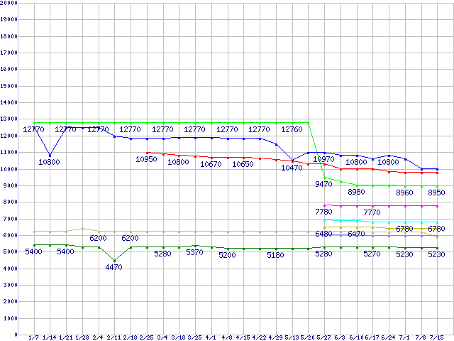 CPU主要製品(最安値1万円未満)の最安値推移↑前グラフ↓次グラフ(2011年1月7日〜2011年7月15日)※このグラフは過去のデータも税率5%相当に調整した税込み相当額のグラフです。凡例Phenom II X4 955 (3.2GHz,L2 512KB×4,L3 6MB,TDP 95W)Core i3-2100 (3.1GHz,TDP 65W)Athlon II X4 615e (2.5GHz,L2 512KB×4,TDP 45W)Pentium G850 (2.9GHz,TDP 65W)Pentium G840 (2.8GHz,TDP 65W)Pentium G620T (2.2GHz,TDP 35W)Pentium G620 (2.6GHz,TDP 65W)Athlon II X2 265 (3.3GHz,L2 1MB×2,TDP 65W)Athlon II X2 255 (3.1GHz,L2 1MB×2,TDP 65W)※製品名をクリックすると個別のグラフを表示します※点線部は販売店が確認できなかった、または調査データがないことを示します