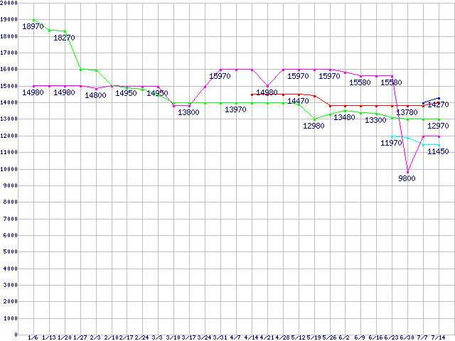 | HDD/SSD主要製品(最安値1万円〜1万5千円未満)の最安値推移 |
