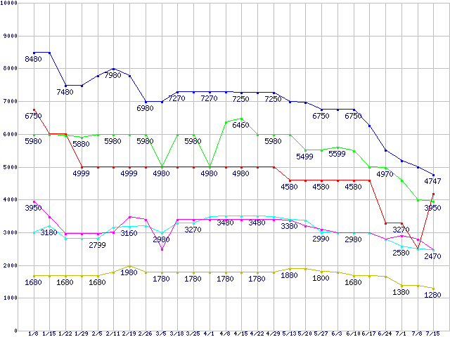 | メモリ主要製品(最安値5千円未満)の最安値推移 |